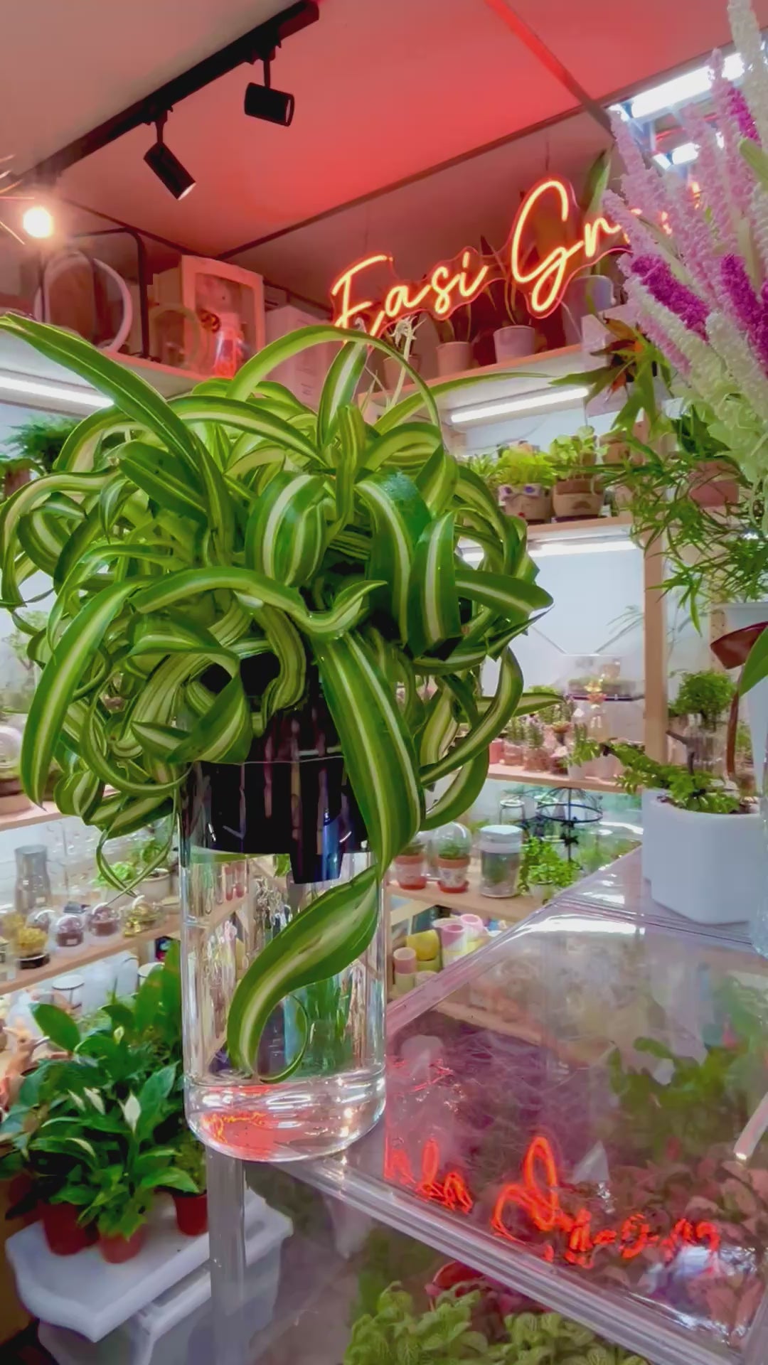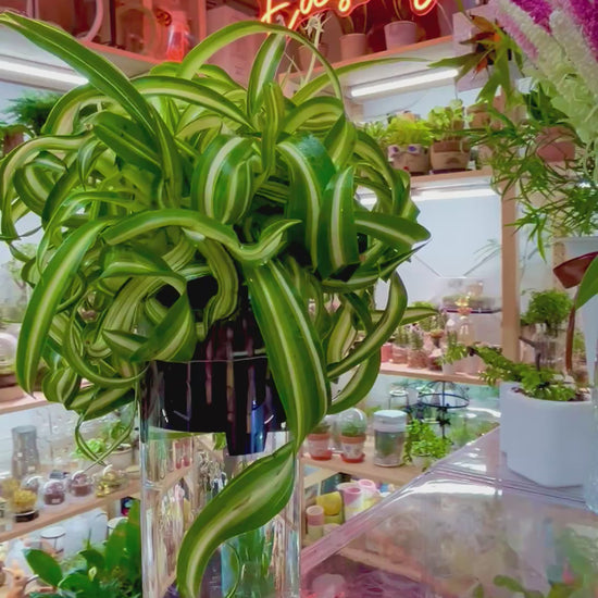 Package includes Curly Spider Plant potted in clear cylinder glass vase with hydroponic fertiliser(for 2 litres of water)